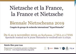Nietzsche et la France, la France et Nietzsche. Biennale Nietzscheana 2019, Parigi, 6-9 novembre 2019, Sorbonne Université, École normale supérieure, Institut d’Études Avancées. Organizzata da Paolo D’Iorio con la collaborazione di Alexandre Avril e David Simonin.