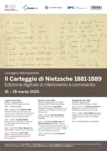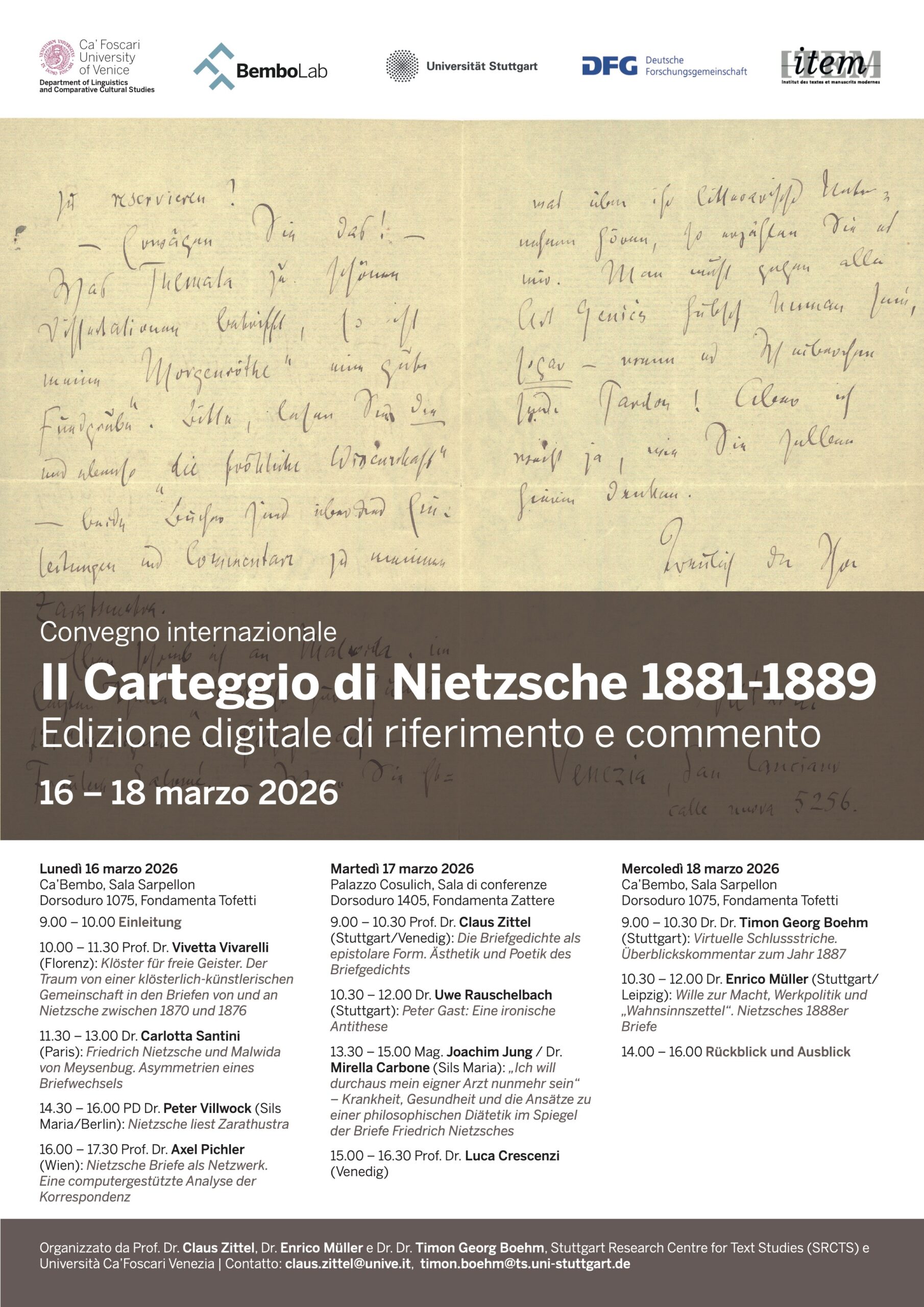 Il carteggio di Nietzsche 1881-1889. Edizione digitale di riferimento e commento, 16-18 marzo 2026. Università Ca’ Foscari di Venezia. Organizzazione Claus Zittel, Enrico Müller, Timon Georg Boehm. Progetto DFG Nietzsches Briefwechsel. Digitale Referenzausgabe und Kommentar.